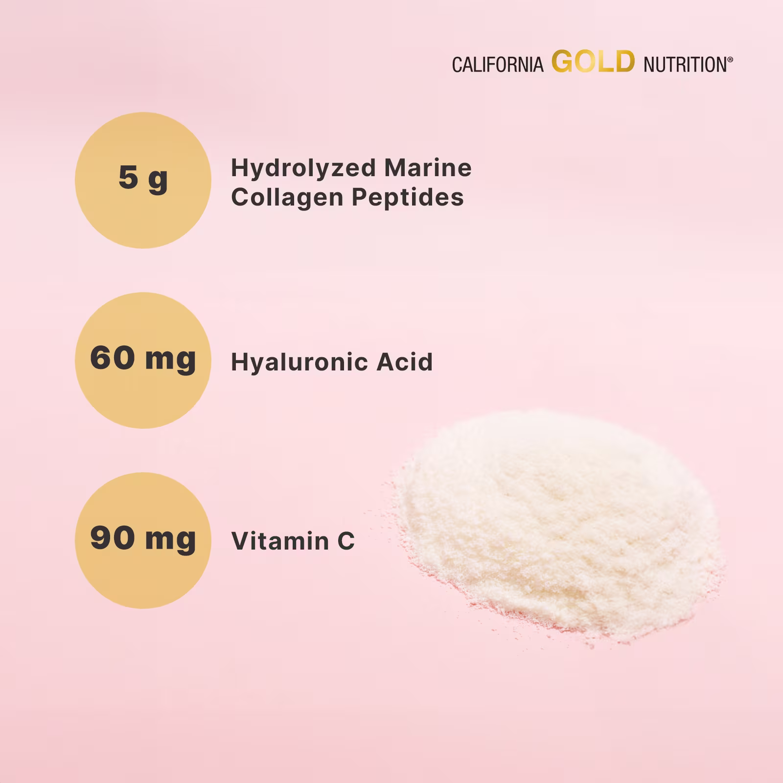 فيتامين جـ (في صورة أسكوربات الكالسيوم)، الصوديوم، ببتيدات الكولاجين البحري المتحللة مائيًا، حمض الهيالورونيك (في صورة هيالورونات الصوديوم)