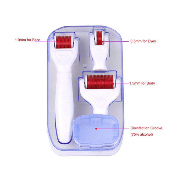 تحتوي هذه المجموعة على 3 احجام مختلفة من الديرما رولر مناسبة للجسم والوجه والعين.