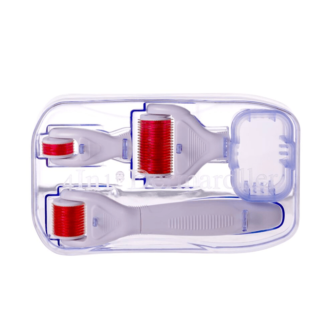 مجموعو ديرما رولر 4 في 1 هي عبارة عن: جهاز إبر صغيرة الحجم يتم تمريرها على الجلد كي تحفز إنتاج الكولاجين وتقلل من ترهل البشرة و ندب حب الشباب. بالإضافة إلى انها تحد من الخطوط الدقيقة والتجاعيد والدوائر السوداء والبقع الناتجة عن التعرضم لأشعة الشمس في الوجه وعلى الجسم