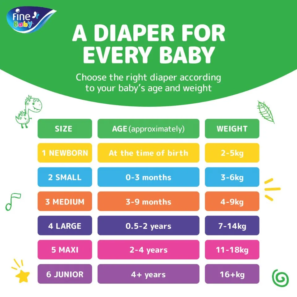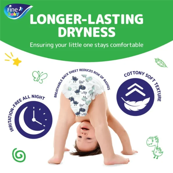 • ورقة خلفية قابلة للتنفس: تتميز حفاضات فاين بيبي بورقة خلفية قابلة للتنفس تعزز تدفق الهواء بشكل صحيح، مما يسمح لبشرة طفلك بالتنفس. يساعد ذلك في الحفاظ على صحة البشرة المثلى، مما يقلل من خطر الطفح الجلدي والتهيج.