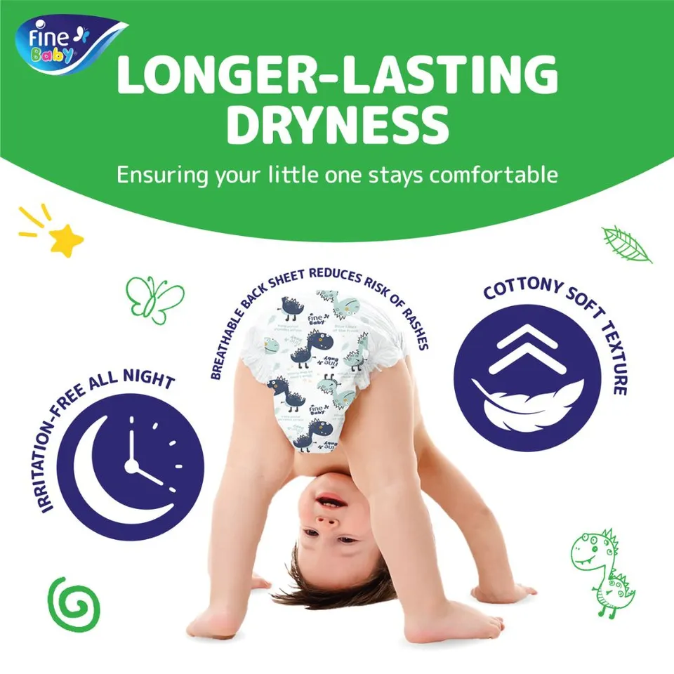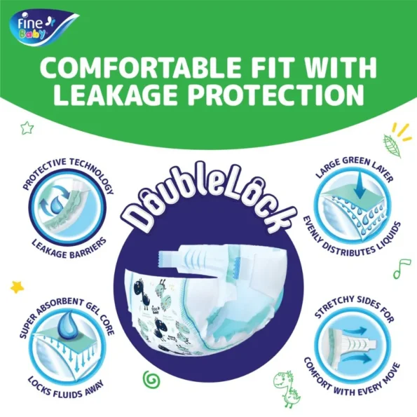 • تكنولوجيا القفل المزدوج وجوانب مرنة: تم تصميم حفاضات فاين بيبي بتكنولوجيا القفل المزدوج وجوانب مرنة، مما يوفر ملاءمة آمنة ويمنع التسرب. تتكيف الحفاضات مع حركات طفلك، مما يمنحهم تجربة مريحة.