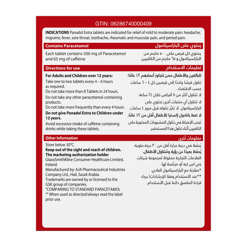 بانادول إكسترا هو دواء مصمم لتوفير تخفيف فعال للألم وخفض الحرارة. تم تركيبه بمركبات محددة تجعله لطيفًا على المعدة ويتم امتصاصه بشكل أسرع في الجسم. هذا المنتج مخصص للأفراد الذين يسعون إلى إدارة شاملة للألم وخفض الحرارة.