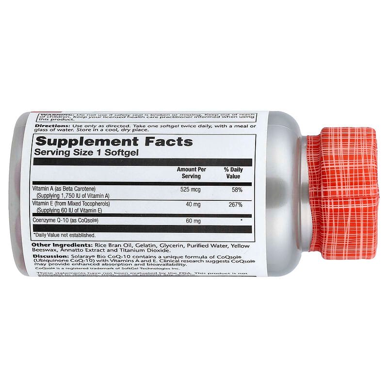 يحتوي Solaray® Bio CoQ-10 على تركيبة فريدة من CoQsol® (Ubiquinone CoQ-10) مع فيتامينات (أ) و (هـ). تشير الأبحاث السريرية إلى أن CoQsol® قد يوفر امتصاصًا معززًا وتوافرًا حيويًا.