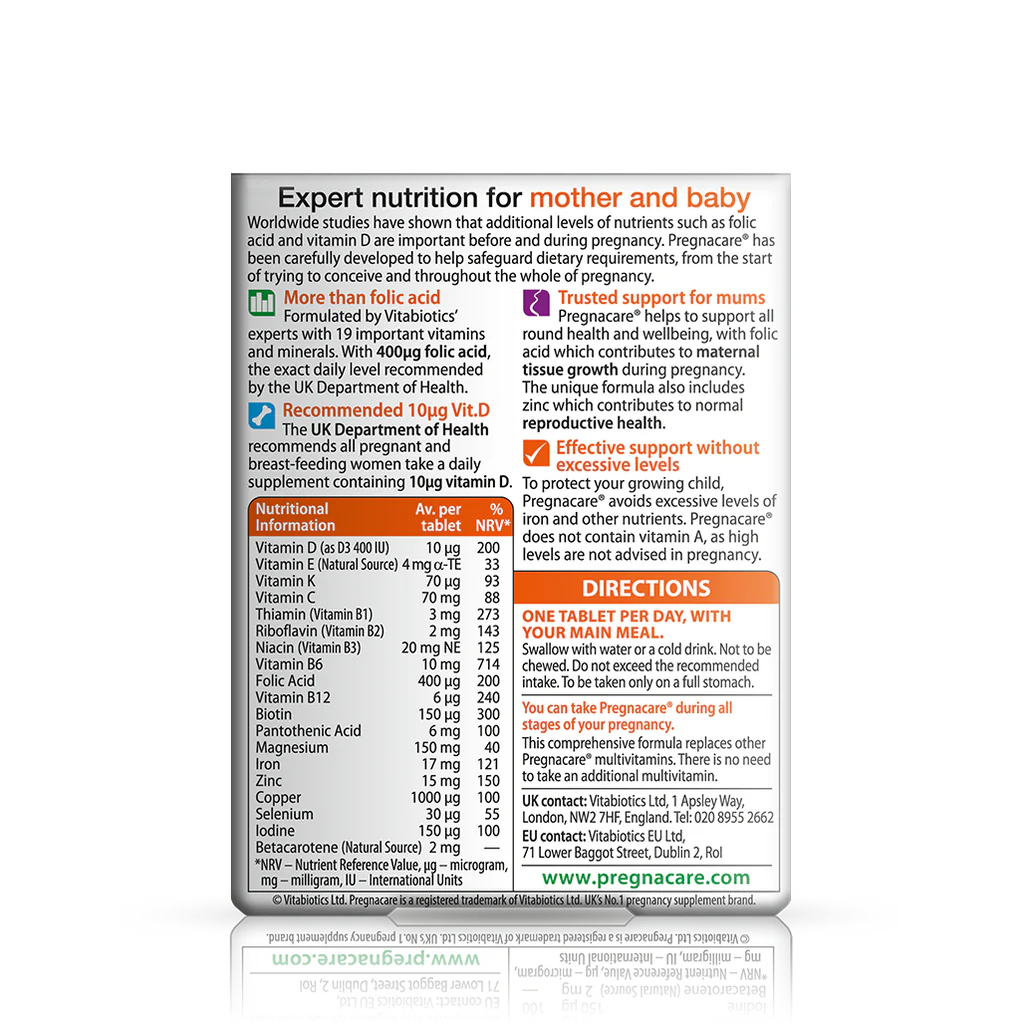 يوصى باستخدام Pregnacare قبل الحمل لبناء مخزون من العناصر الغذائية مثل الحديد لدى النساء اللاتي يحاولن الإنجاب. التغذية الجيدة مهمة للمساعدة في إعداد جسم المرأة لمواجهة المتطلبات الإضافية التي تقع عليه أثناء الحمل. بعض العناصر الغذائية، مثل حمض الفوليك وفيتامين ب 12 والزنك، لها أيضًا أهمية خاصة منذ اللحظة الأولى للحمل. يساهم الزنك في الخصوبة الطبيعية والتكاثر بينما يساهم فيتامين ب 12 في تكوين خلايا الدم الحمراء الطبيعية وله أيضًا دور في عملية انقسام الخلايا.